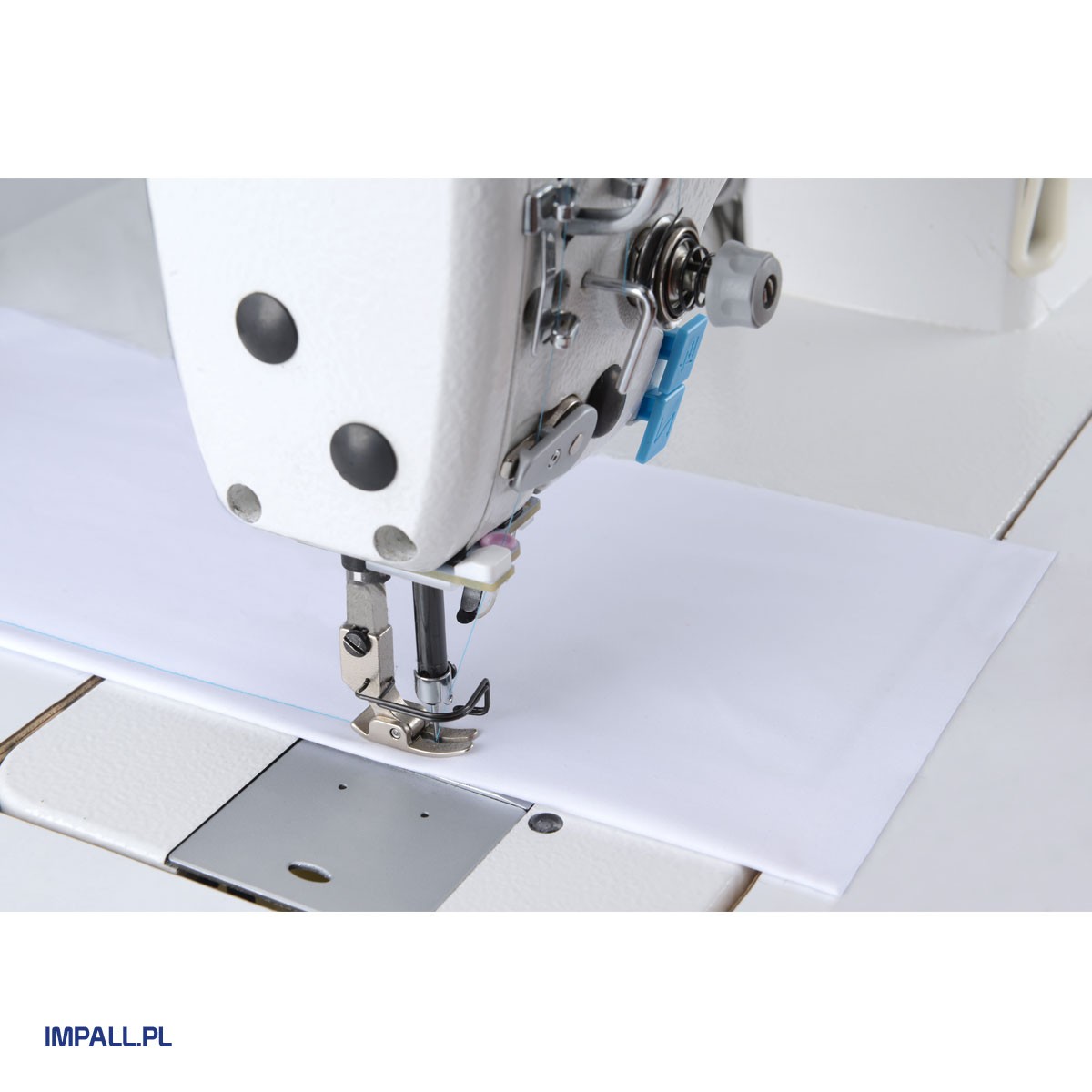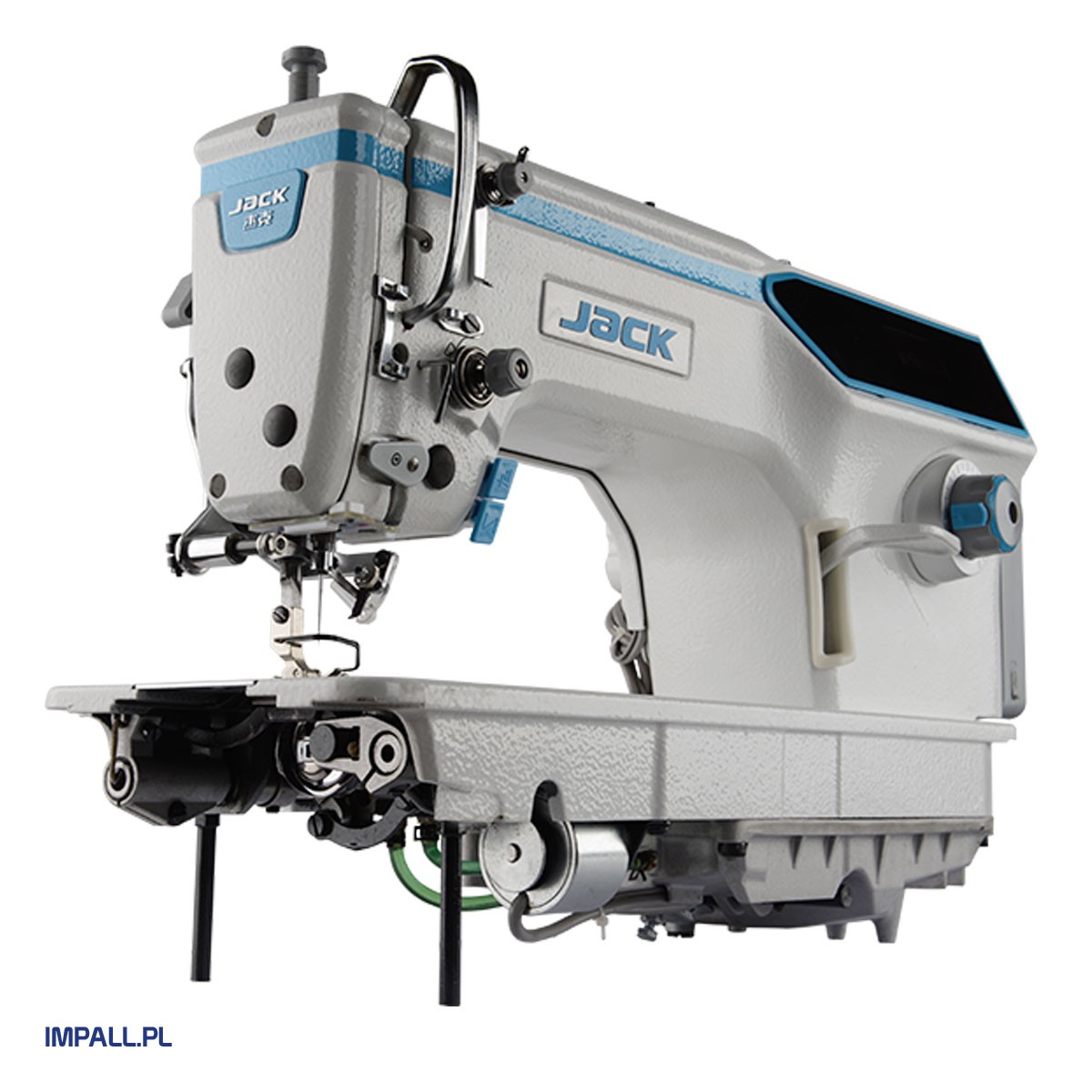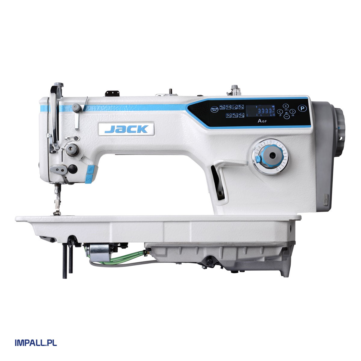 Stębnówka automatyczna JACK A6F-E z transportem ząbkowo-igłowym i powiększonym polem pracy (30 cm). Wyposażona w silnik Direct Drive, zamknięty system smarowania, oświetlenie LED i port USB. Funkcje automatyczne: obcinanie nici, pozycjonowanie igły, rygiel początkowy i końcowy, podnoszenie stopki. Prędkość do 4000 ściegów/min, długość ściegu do 4,5 mm, wznios stopki do 13 mm. Maszyna kompletna, gotowa do pracy, z 3-letnią gwarancją i wsparciem serwisu.