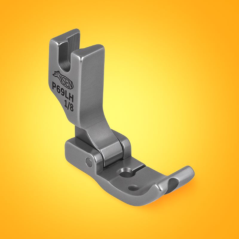 P69L lewa lub P69R prawa – klasyczna stopka lewa do prowadzenia szwu blisko krawędzi materiału lub wypukłego elementu. Ma płozą nieruchomą, dobrze sprawdzającą się w standardowych pracach wykończeniowych i przy szyciu ozdobnych wypustek.