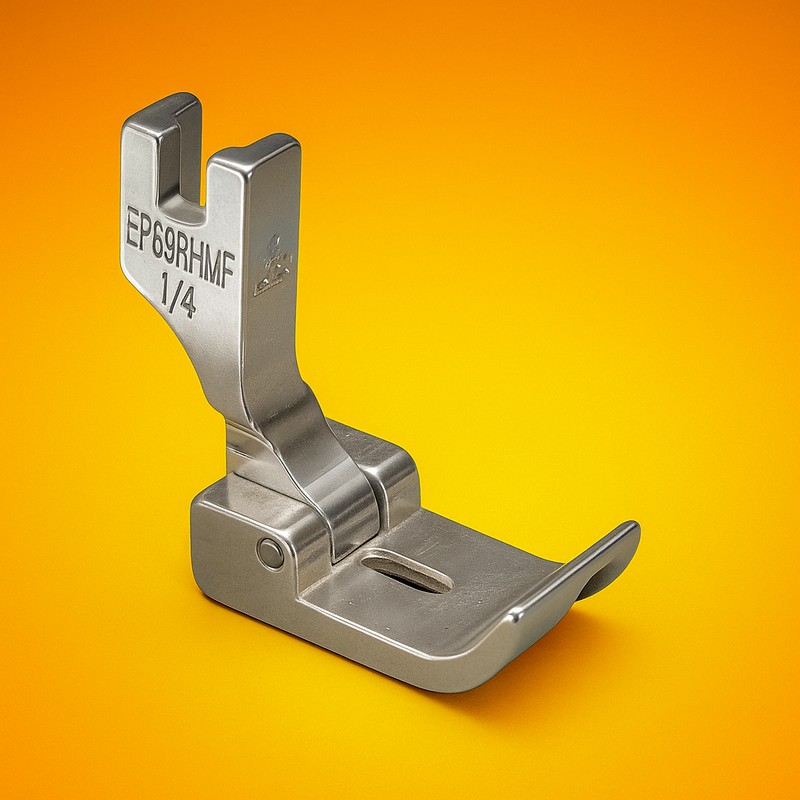 P69L lewa lub P69R prawa – klasyczna stopka lewa do prowadzenia szwu blisko krawędzi materiału lub wypukłego elementu. Ma płozą nieruchomą, dobrze sprawdzającą się w standardowych pracach wykończeniowych i przy szyciu ozdobnych wypustek.